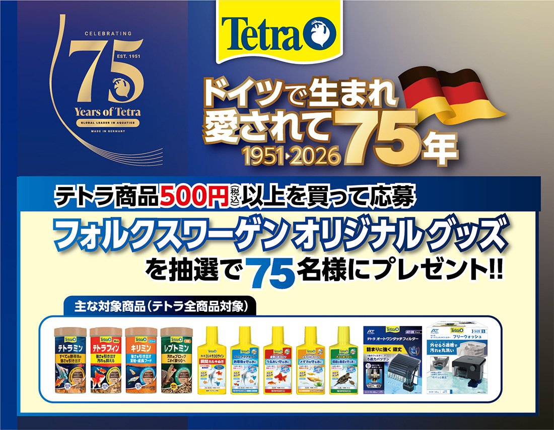 本キャンペーンは、テトラ商品を500円(税込)以上ご購入のレシートでご応募いただけます。抽選で合計75名様にフォルクスワーゲン オリジナルグッズをプレゼントします。